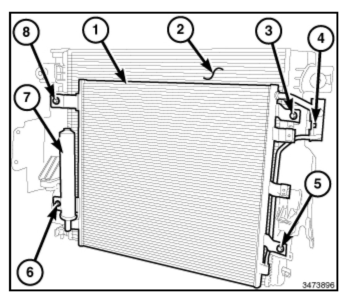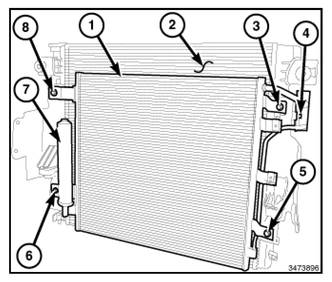 18. Remove the five bolts (3, 4, 5, 6 and 8) that secure the A/C condenser to the radiator and separate the condenser from the radiator.
