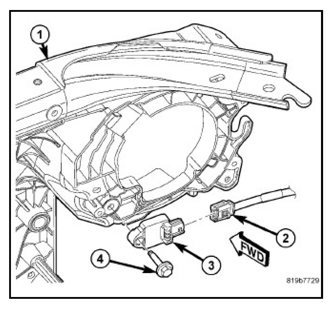 2. Remove the screw (4) that secures the impact sensor (3) to the back (engine compartment side) of the front end module carrier (1) inboard of the right or left headlamp.