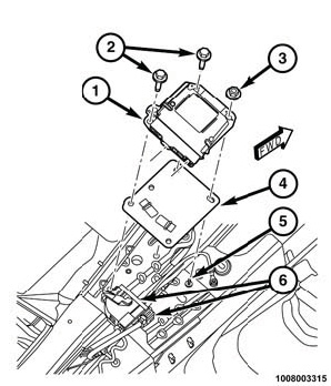 3. Disconnect the instrument panel and body wire harness connectors (6) from the Occupant Restraint Controller (ORC) (1) connector receptacles located on the rearward facing side of the module. To disconnect the wire harness connectors from the ORC, depress the release tab and lift the lever arm to the fully open position on each connector. Disconnecting the smaller connector first will allow easier access for disconnecting the large connector.