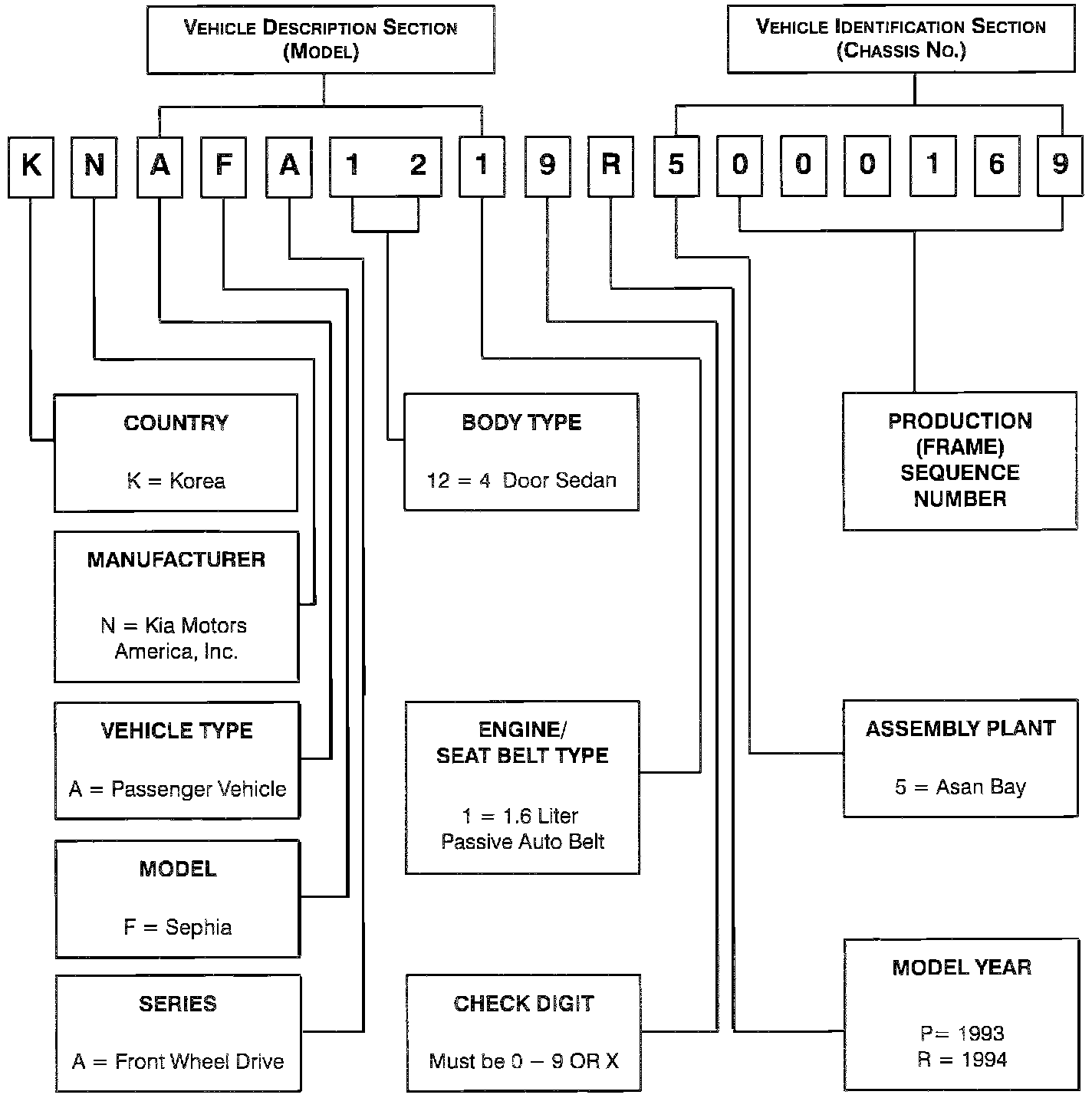 The Vehicle Identification Number (VIN) for the Kia Sephia is a 17-digit number stamped on a metal plate that is located on the driver's side of the dash panel (6) visible from outside of the vehicle through the windshield (1). The VIN is also stamped into the passenger side of the engine compartment bulkhead (2).
