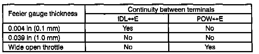 3. Insert a feeler gauge between the throttle stop screw and the stop lever and check the continuity between terminals.