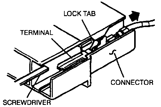 Insert push-tool, or thin piece of metal such as a small screwdriver, from the terminal side of the connector, and then with the locking tabs pressed down, pull the terminal out from the rear side of the connector.