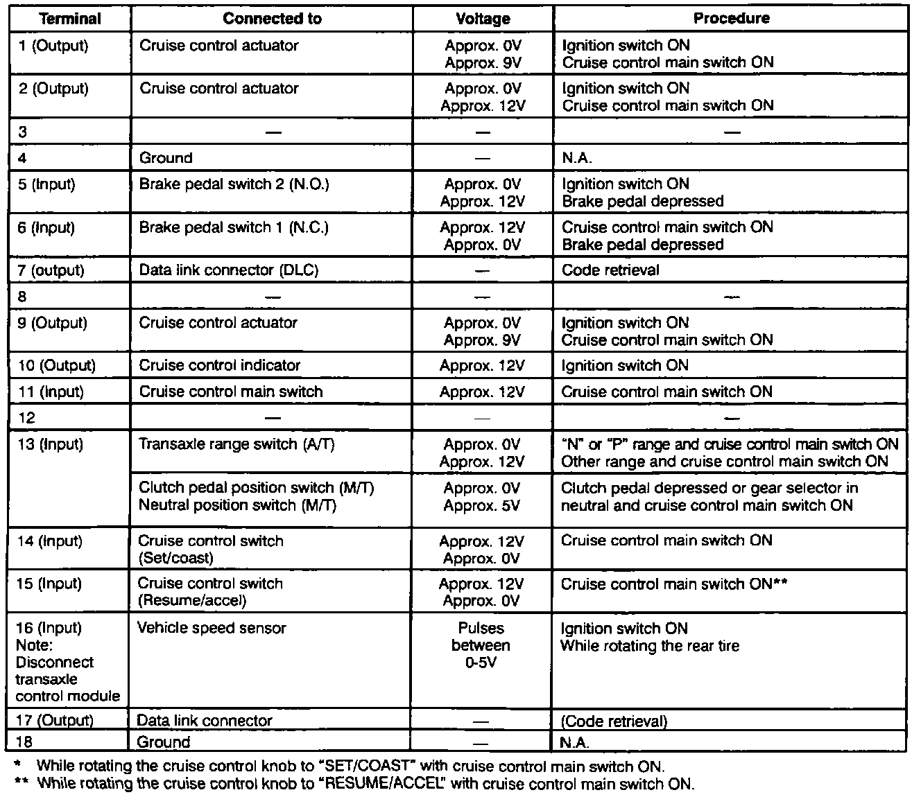 3. If the voltage measured is not in agreement with the voltage listed in the table, and the table lists the terminal as an output, then consider the cruise control unit to be defective. If the terminal is listed as an input, then refer to other circuit tests that cover the component to which that terminal is connected.