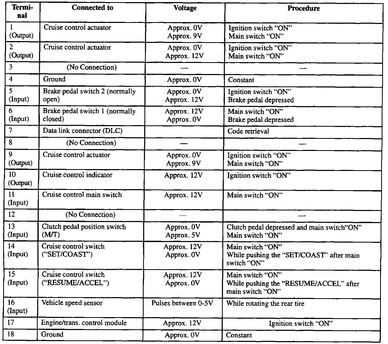 1. Connect a voltmeter between cruise control unit terminals and ground. (Connector C214 connected.)