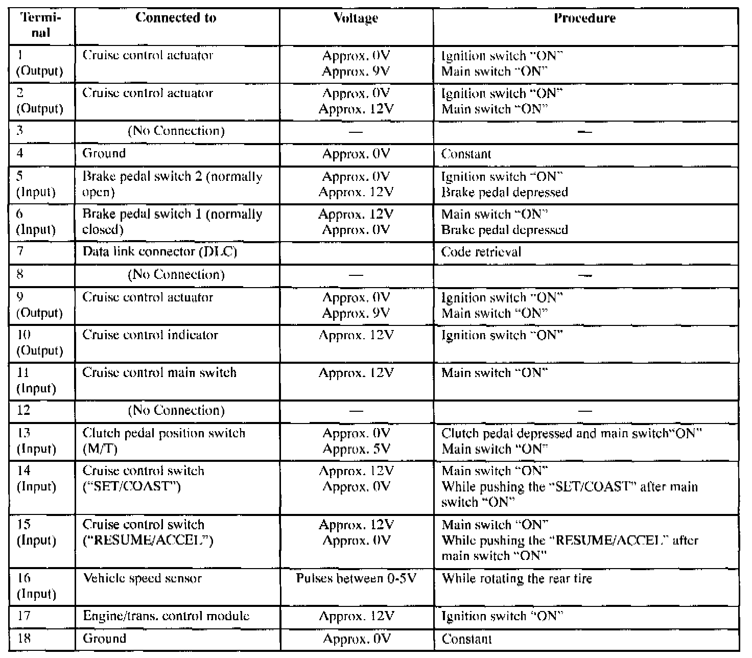 1. Connect a voltmeter between cruise control unit terminals and ground. (Connector C214 connected.)
