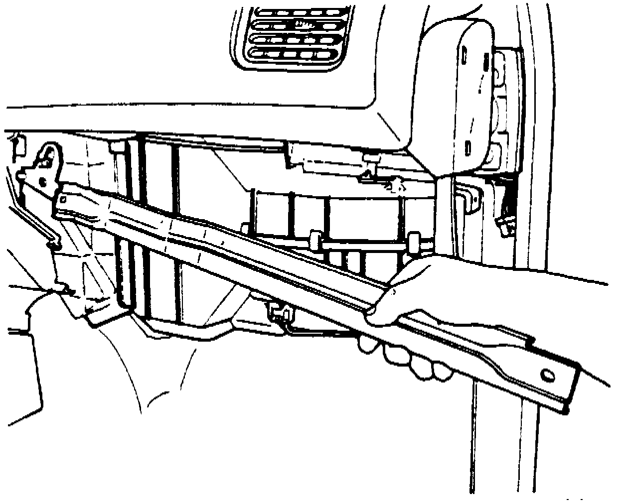 14. Remove right bolt attaching lower right side of instrument panel lower support and remove support.