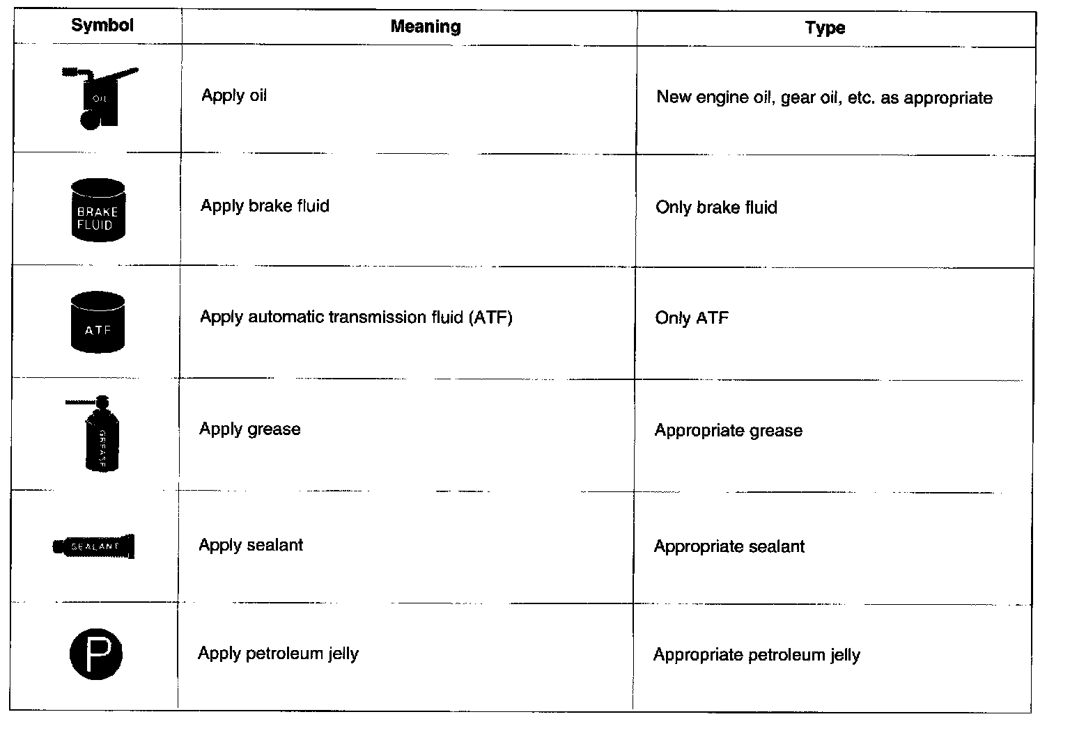 There are six primary symbols used to complement illustrations. These symbols indicate the areas to apply such materials during service