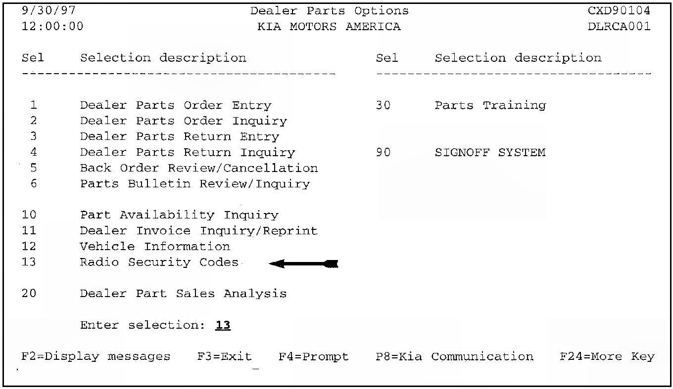 1. Through the Dealer Parts System screen, enter selection 13, Radio Security Codes (or selection 3 through the Dealer Warranty/Service screen).