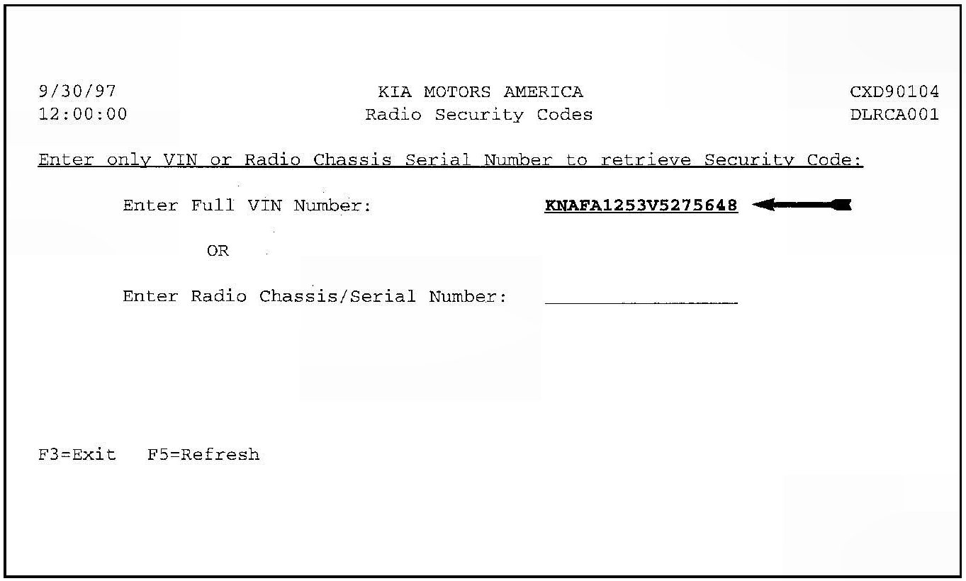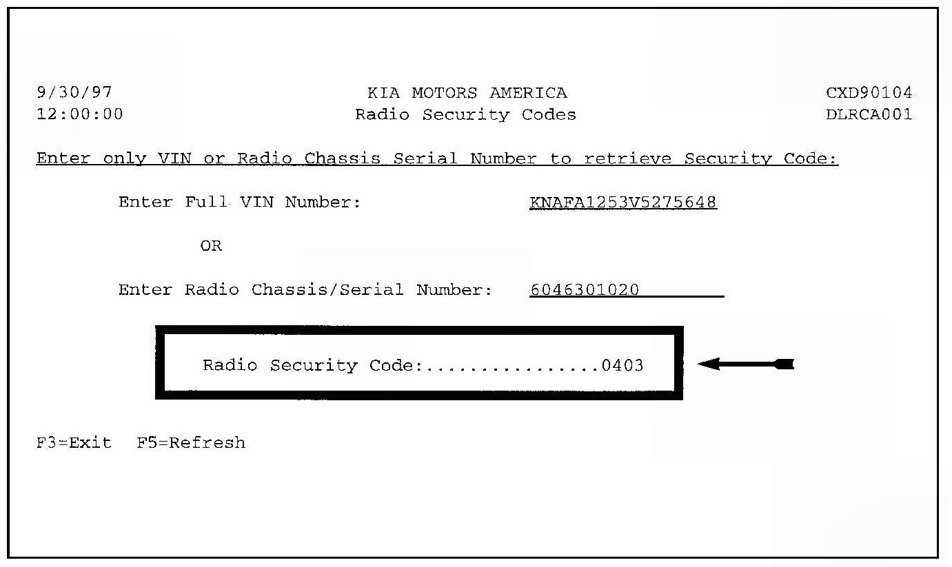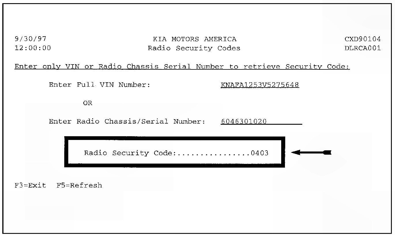 The retrieval procedures contained in this bulletin can only be used to retrieve radio security codes for 1996 and later vehicles. Radio security codes for 1995 and prior vehicles can be obtained by calling the Kia Technical Assistance Center To avoid delay please provide the representative with the radio chassis number or include it when leaving a message. By doing this the technical assistance center representative will have your radio security code when he calls back.