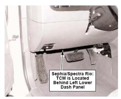 6. Locate TCM under left lower dash area. (Sephia/Spectra shown; Rio similar).