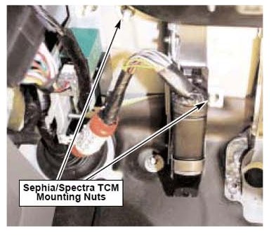 9. Sephia/Spectra: Loosen and remove nuts (2) that secure TCM mounting bracket to firewall.