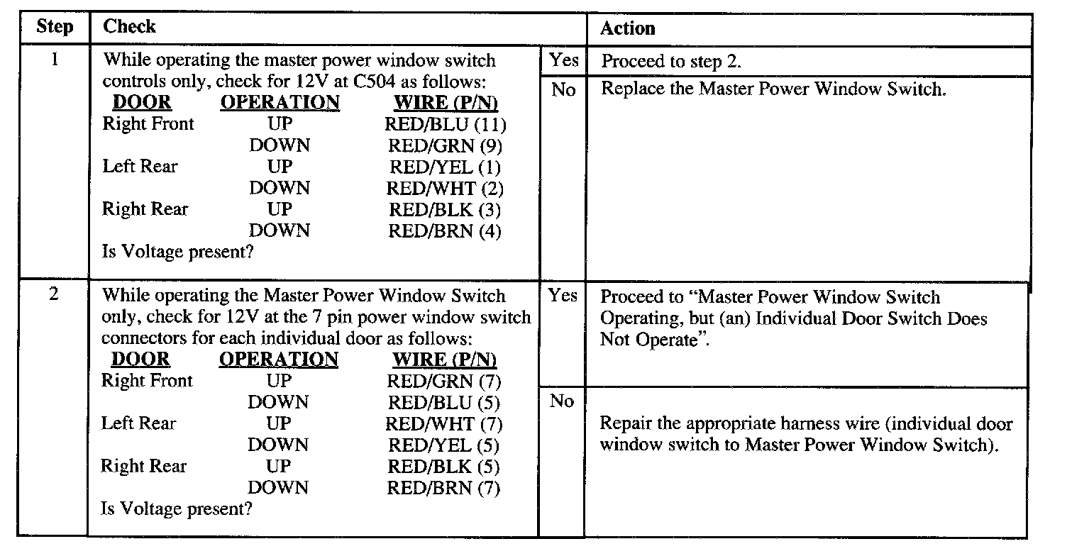 Preliminary Check: Verify that the master power window switch operates drivers window. If it does not, first perform procedure for None of the Power Windows Operate.