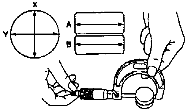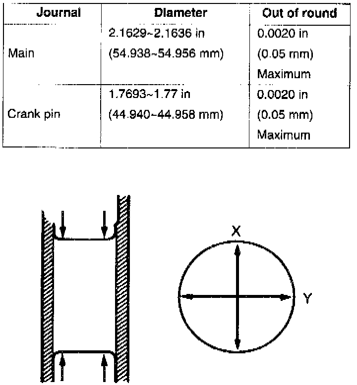 5. Use a micrometer to measure crankshaft main bearing journals and crank pin journals at X and Y direction as shown.