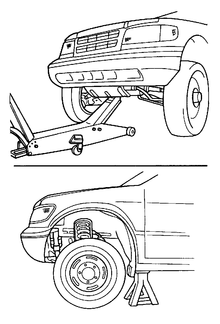 When vehicle is jacked from front crossmember only, safety stands should be placed at the second crossmember on both sides of the body frame.