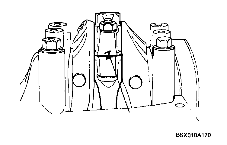 ^ When installing the connecting rods, match marks made on the connecting rod and cap to reference mark made on cylinder block to prevent oil starvation to the connecting rod bearings.