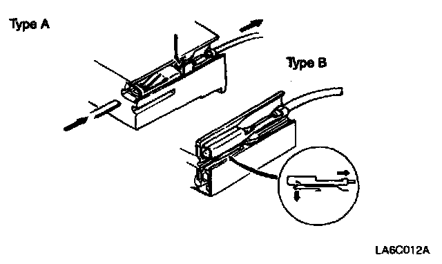 Insert a thin piece of metal from the terminal side of the connector, and then, with the terminal locking tab pressed down, pull the terminal out of the connector.