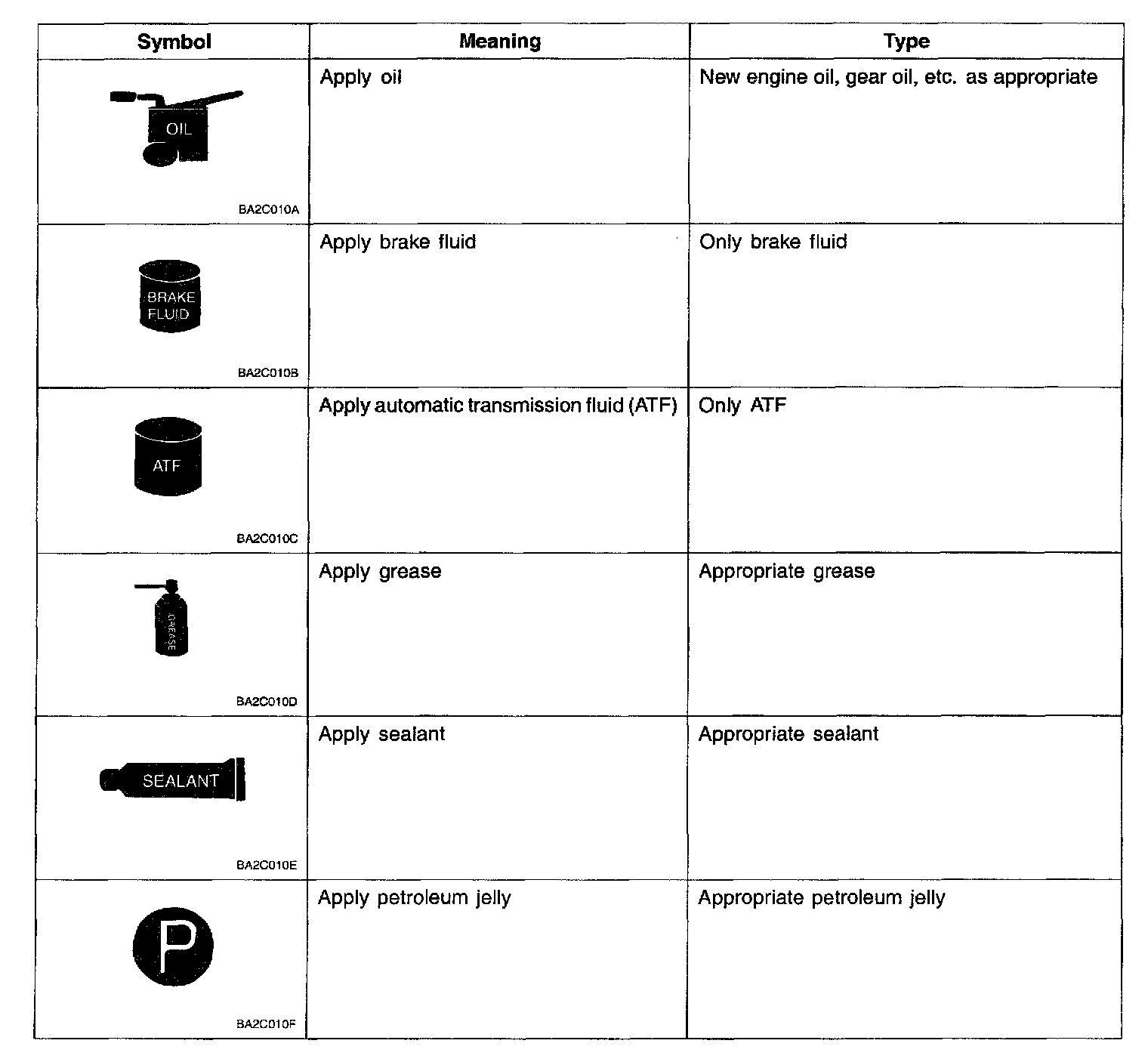 There are six primary symbols used to complement illustrations. These symbols indicate the areas to apply such materials during service.