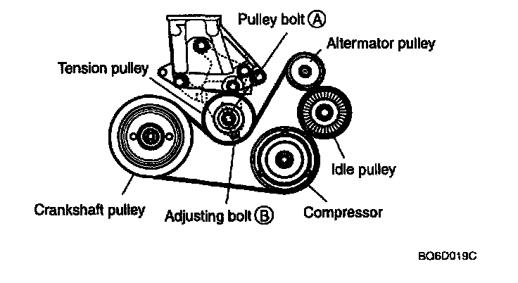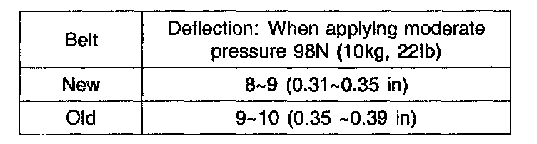 Turn the adjusting bolt B and adjust the deflection of the drive belt to the within specification.