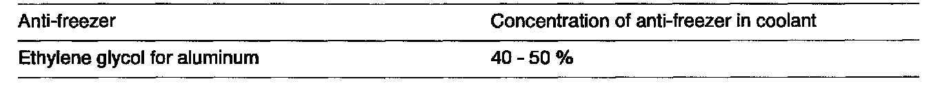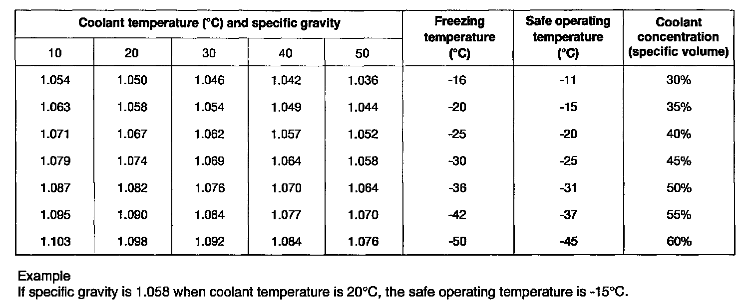 Caution: If the concentration of the coolant is below 30%, the anti-corrosion property will be adversely affected In addition, if the concentration is above 60%, both the anti-freeze and engine cooling properties will decrease, affect the engine adversely. For these reasons, be sure to maintain the concentration level within the specified range. Do not use together with another brand