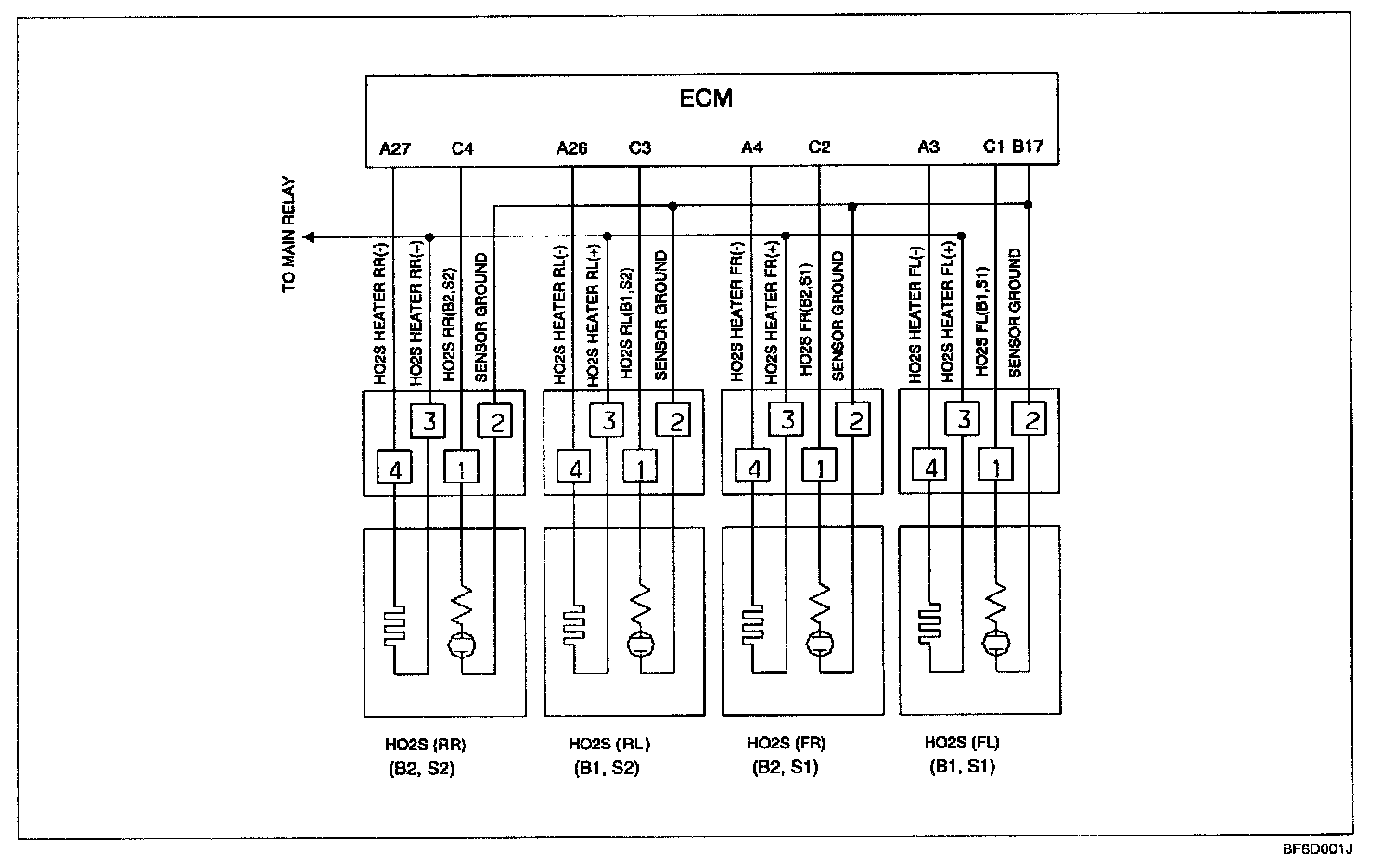 HEATED OXYGEN SENSOR (HO2S)The heated oxygen sensor senses the oxygen concentration in exhaust gas, converts it into a voltage, which is sent to the ECM. The oxygen sensor outputs about 1 V when the air fuel ratio is richer than the theoretical ratio, and outputs about 0 V when the ratio is leaner (higher oxygen concentration in exhaust gas.). The ECM controls the fuel injection ratio based on this signal so that the air fuel ratio is maintained at the theoretical ratio. The oxygen sensor has a heating element which ensures the sensor performance during all driving conditions.