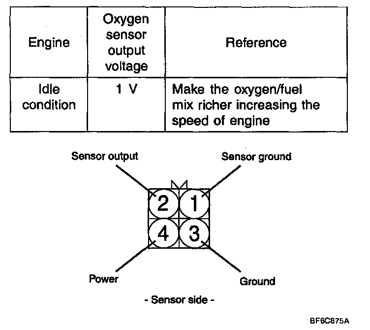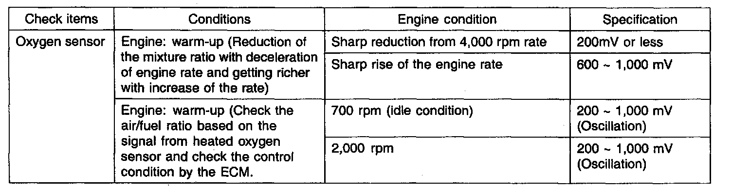 The main point to check the oxygen sensor output function is to check the output voltage for being 0.1 - 0.9 V and the frequency 1.1 Hz at the engine rate of 3000 rpm after full warming up.
