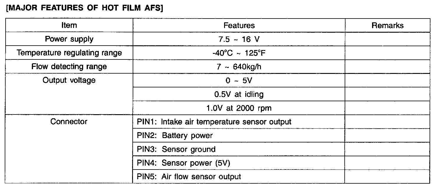 The air flow sensor adopts the feature of maintaining a certain temperature of the heater for sensor to make the hot film element detect the air flow and send related signal to the ECM. The ECM then determines the fuel amount and ignition timing and check the information to apply the fuel and A/C load correction.