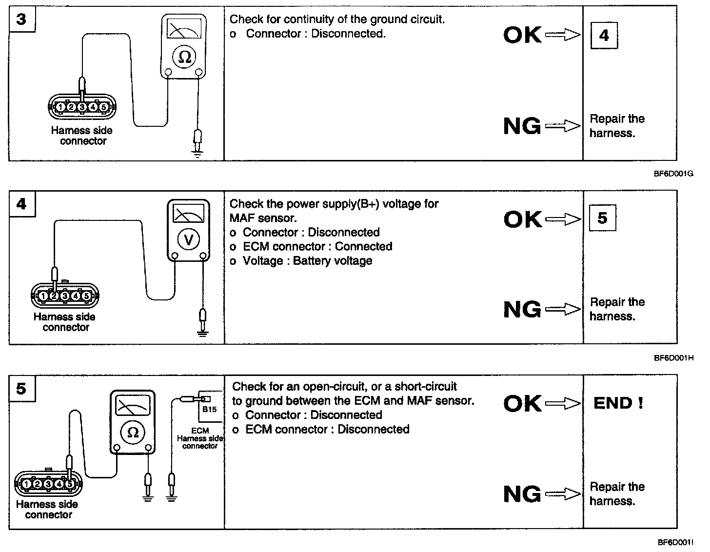 2. If the MAFS sensor output voltage is other than 0 when the ignition switch is turned ON (do not start the engine), check for faulty MAFS and ECM.