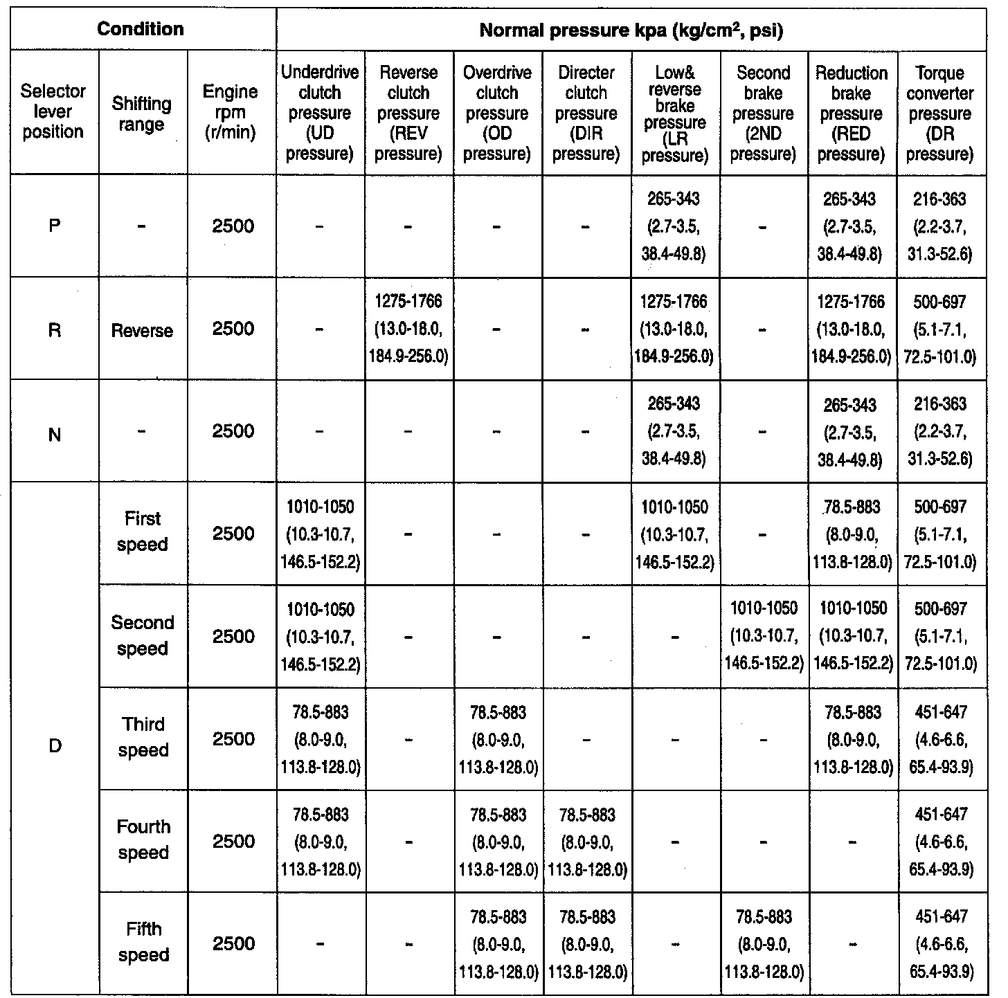 Normal Fluid Pressure Specification Table