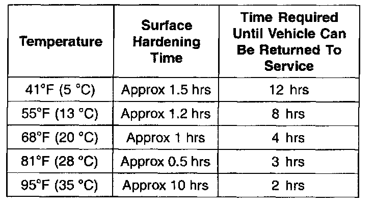 NOTE: The following cure times may be critical. Attempting to replace a windshield in ambient temperature over 95 °F (35 °C) should be avoided because the surface of the sealant may harden before completing the application.