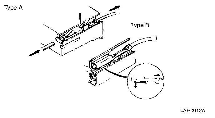 Insert a thin piece of metal from the terminal side of the connector, and then, with the terminal locking tab pressed down, pull the terminal out of the connector.