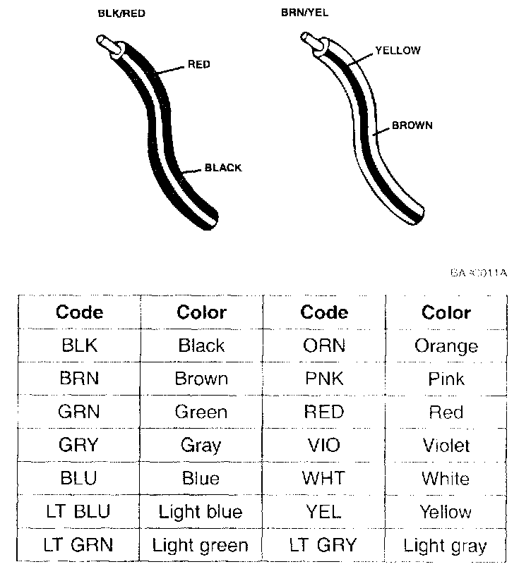 Two-color wires are indicated by a two-color code symbol. The first color indicates the base color of the wire; the second color indicates the color of the stripe.