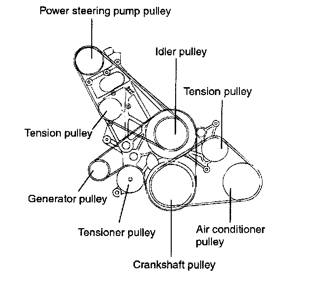 ADJUSTING DRIVE BELT AND TENSIONER1. Hang the belt on the pulley of the tensioner and install the tensioner. (If the tensioner is already installed, loosen its mounting bolts to allow belt installation.)