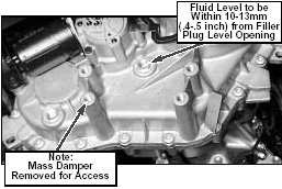 When checking the fluid level through the opening of the filler plug (note that mass damper may have to be removed for proper access, as shown in photo), check to see that the fluid level is no more than 10 - 13 mm (0.4 - 0.5 inches) below the level plug opening. Add fluid as required only to bring the level up to the new range. Do not fill to the level of the filler plug opening.