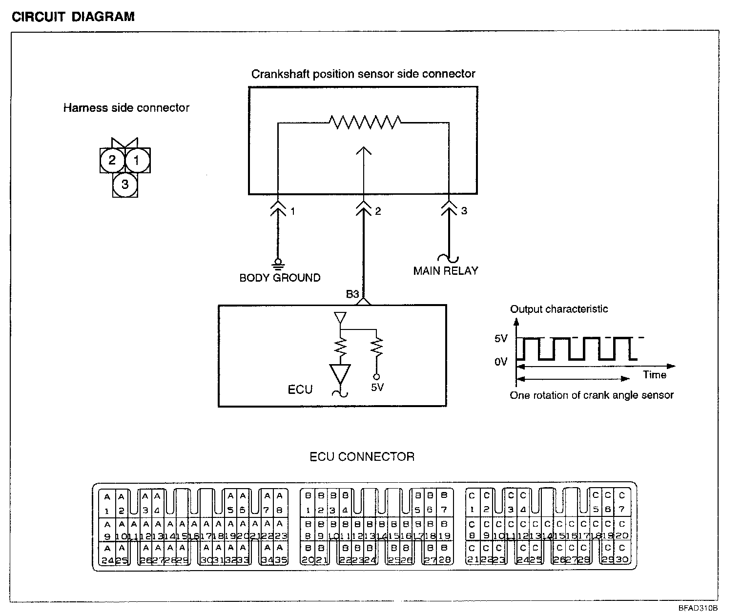 1. If unexpected shocks are felt during driving or the engine stalls suddenly, shake the crankshaft position sensor harness. If this causes the engine to stall, check for poor sensor connector contact.