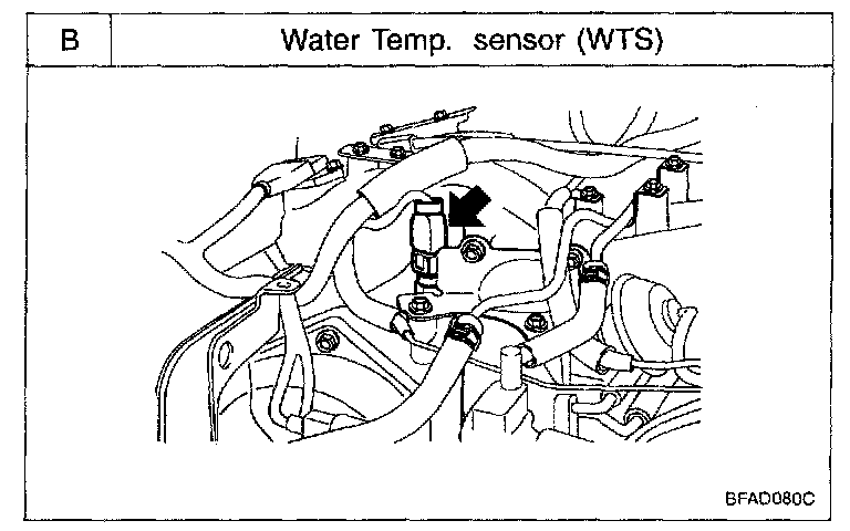 The Water temperature sensor installed in the water passage of the cylinder head detects the water temperature and emits signals to the ECU. This part employs a thermistor which is sensitive to changes in temperature. The electric resistance of the thermistor decreases in response to a temperature rise (NTC). The ECU determines water temperature by the sensor output voltage and provides optimum fuel enrichment when the engine is cold.