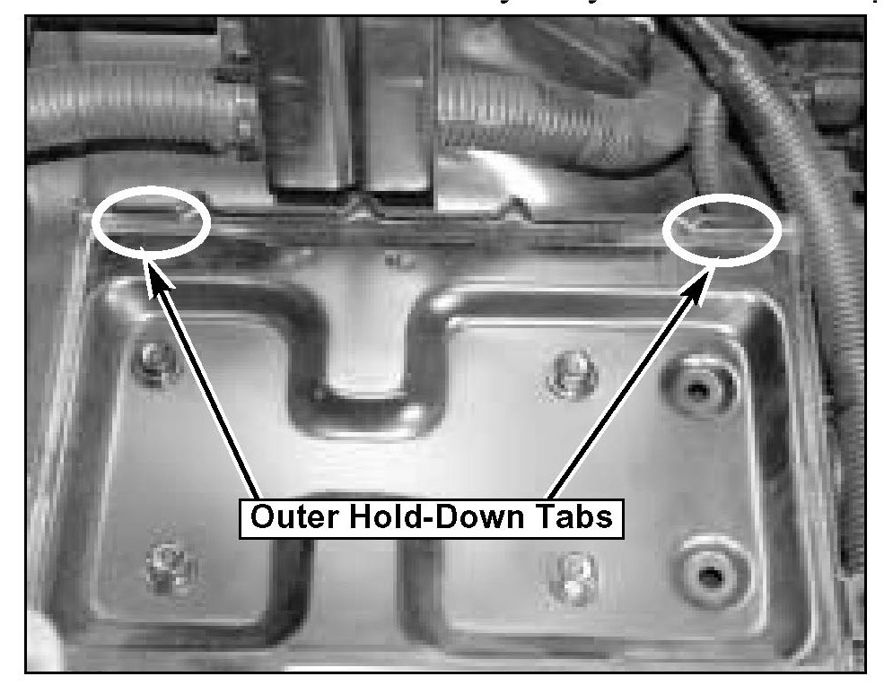 1. Locate the outer hold-down tabs on the battery tray as shown in photo.