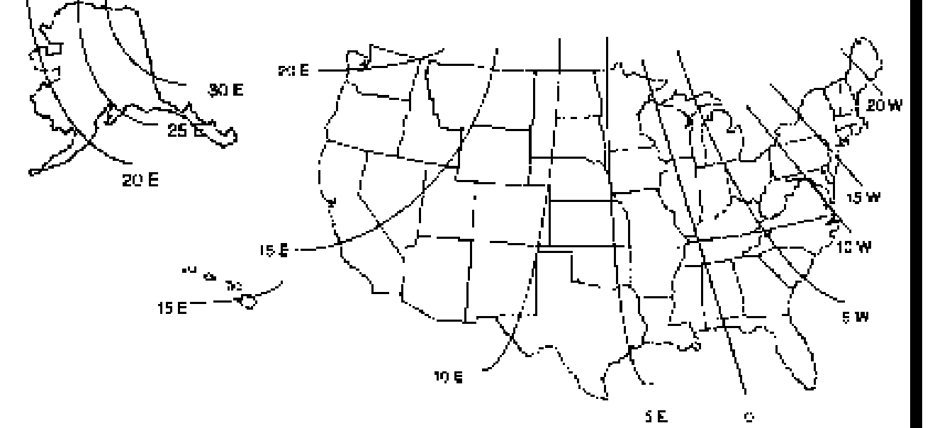 3. Select the degree of correction from the map shown below (Example: Los Angeles, California would be 15E).