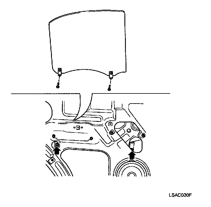 1. Remove window glass guide (front) bolts (2) and screw (1).