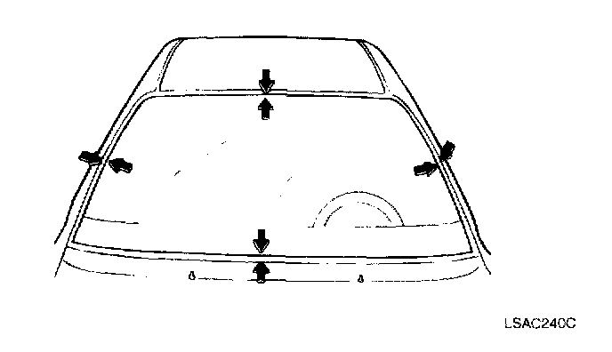 3. Center a new windshield glass in the opening. Mark the location by marking lines across the glass and body with a grease pencil at the four points as shown.