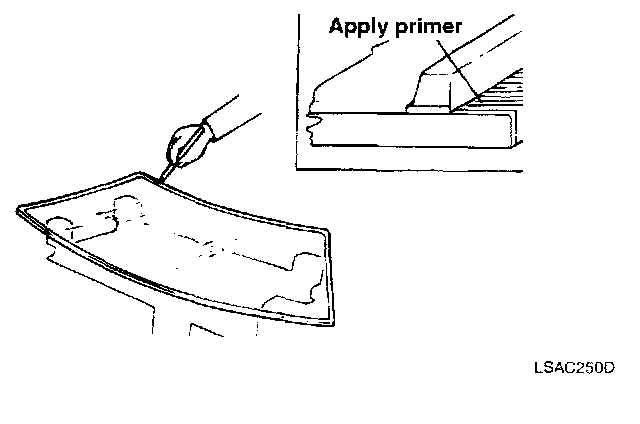 8. Apply a light coat of body primer to the original sealant remaining around the window opening flange. The glass should be installed within 5 minutes after you apply the primer.