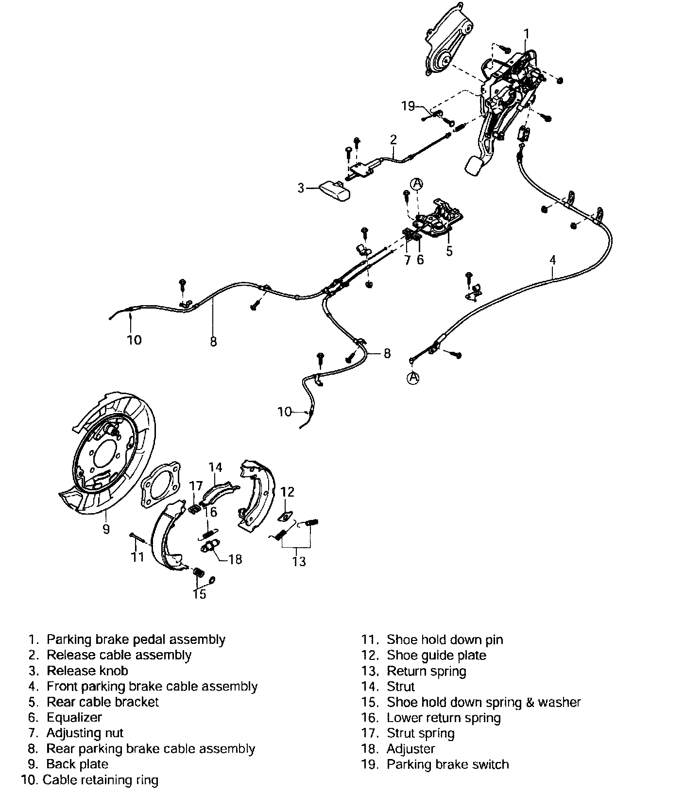 5. After disconnecting the front parking brake cable,, remove the parking brake pedal assembly.
