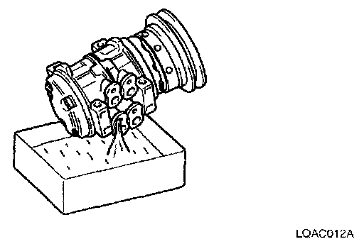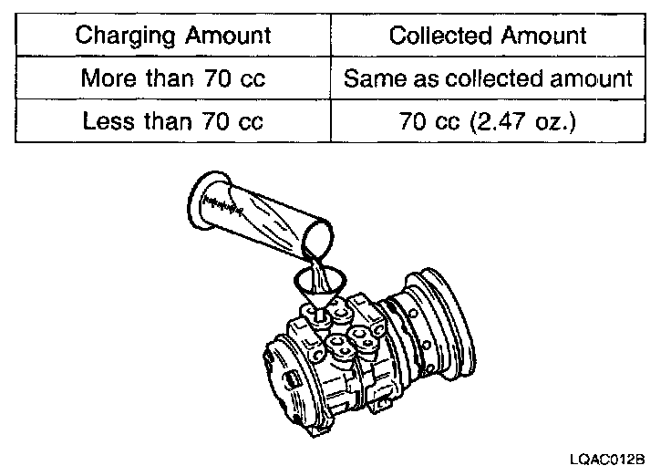 150 cc (5.29 oz.) of oil is charged in compressor (service parts). So it is necessary to drain the proper amount of oil from the new compressor.
