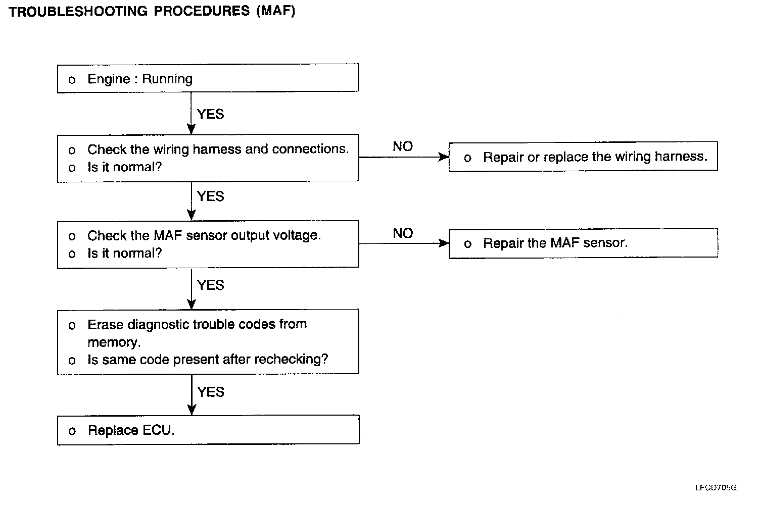 3. If the engine can idle even if the MAF sensor output voltage is out of specification, check for the following conditions;
