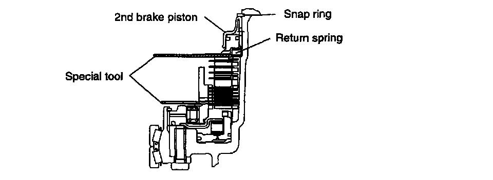 Replace/Lit brake plate using the special tool, and install the brake disc, the brake plate, and the snap ring as illustrated on the figure. Install the reaction plate and the snap ring. Move the special tool and measure the end play. Adjust the end play into standard range using a new snap ring.