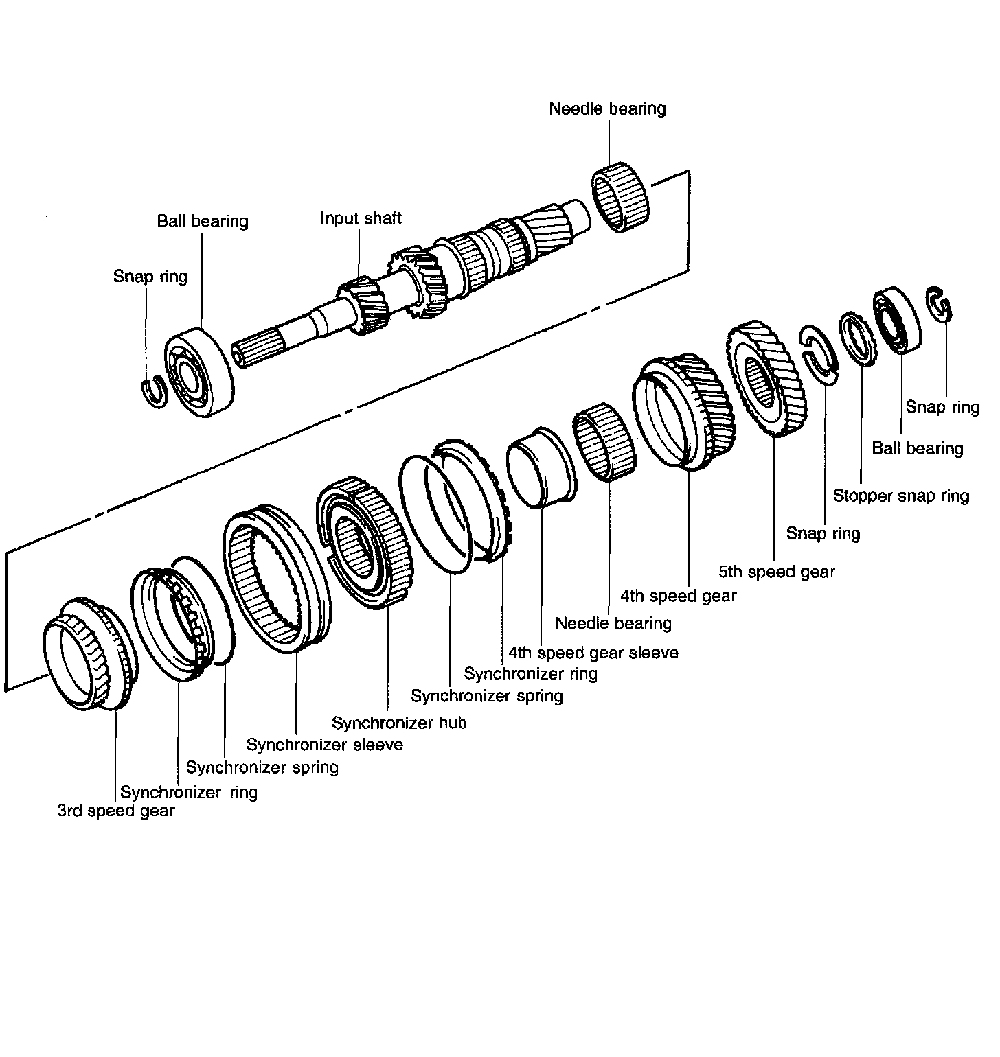 2. Remove the stopper snap ring, snap ring, 5th and 4th speed gear, needle roller bearing, 4th speed gear sleeve, synchronizer ring (3rd & 4th), synchronizer spring (1st, 2nd, 3rd, 4th), synchronizer sleeve (3rd & 4th), 3rd speed gear and needle roller bearing.