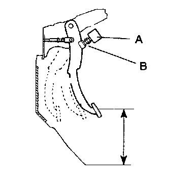 2. Loosen the locknut B and turn the switch A until it does not contact the pedal.