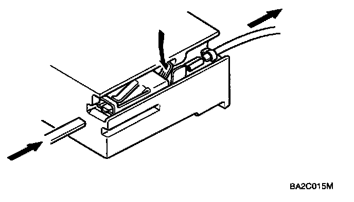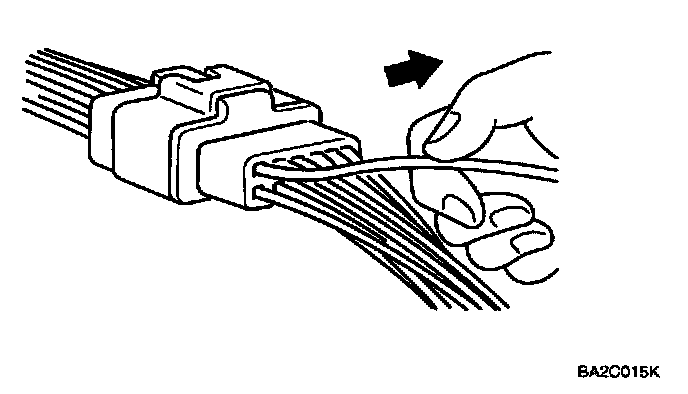 Insert a thin piece of metal from the terminal side of the connector, and then, with the terminal locking tab pressed down, pull the terminal out of the connector.