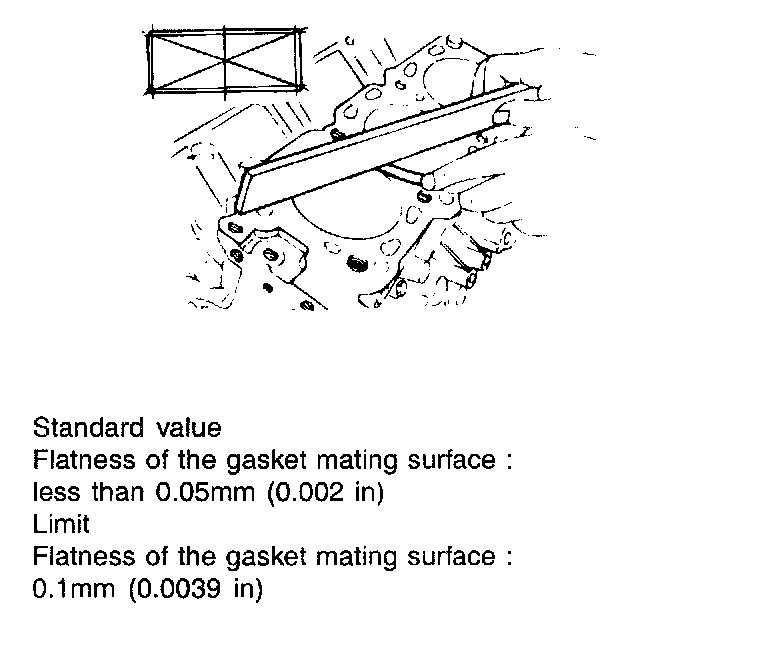 7. Check the flatness of the upper surface. If the top surface exceeds limits, grind it to a minimum limit value or replace. (Measuring method is same as that of cylinder head flatness.)