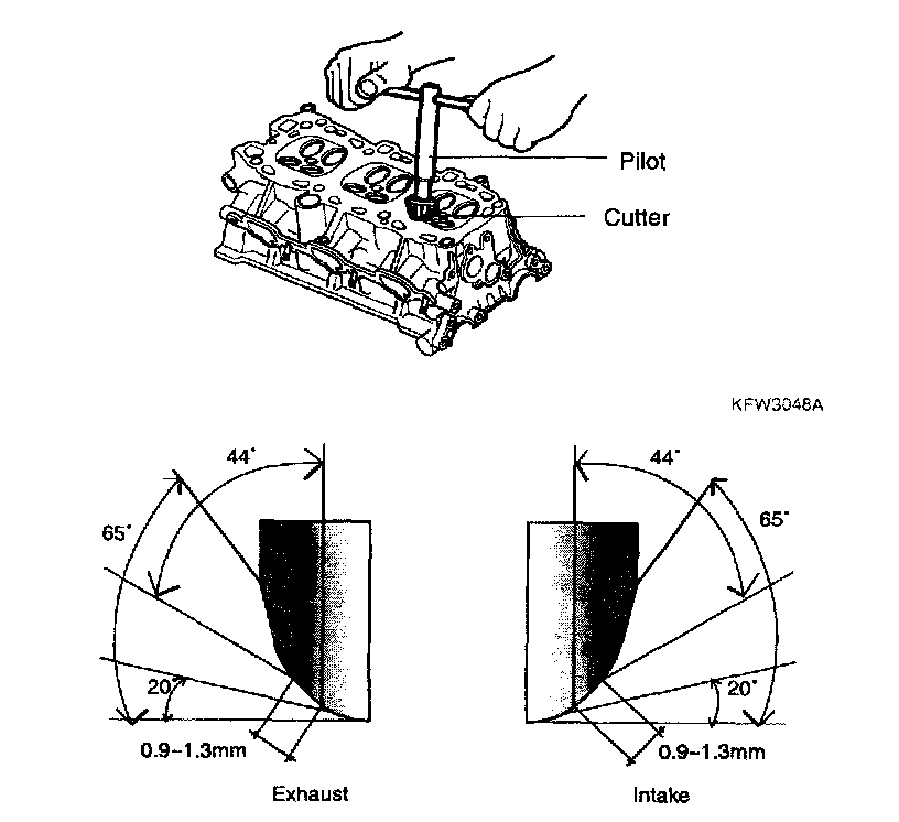 Inspect for any trace of overheating and the contact state of valve face. If necessary, repair or replace it. When repairing, inspect for wear in the valve guide. If the guide is worn, replace it and adjust the seat ring. Adjust the valve seat with grinder or cutter making valve seat contact width from the center of valve face be in the specified value. When adjusting the exhaust valve seat, use the valve seat cutter or pilot. After adjustment, lapping process be made by using applying compound on the valve and valve seat.