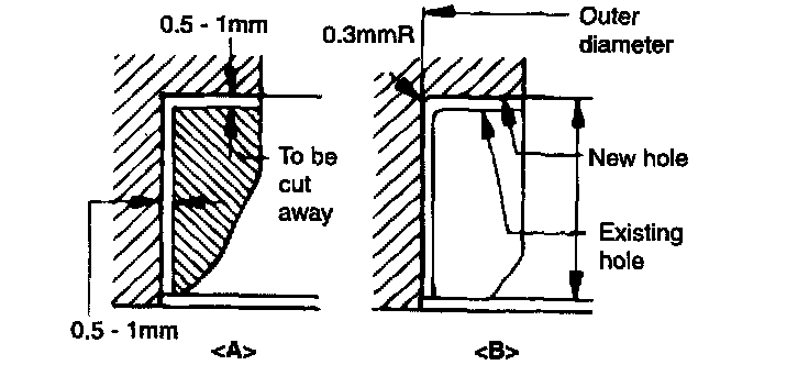 1. If the valve seat insert is excessively worn, cut out the insert wall using valve seat cover at normal temperature like "A" shown in the picture.